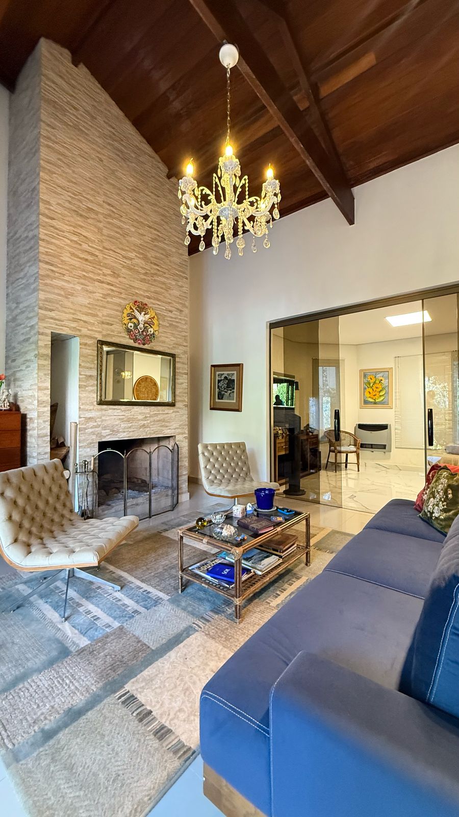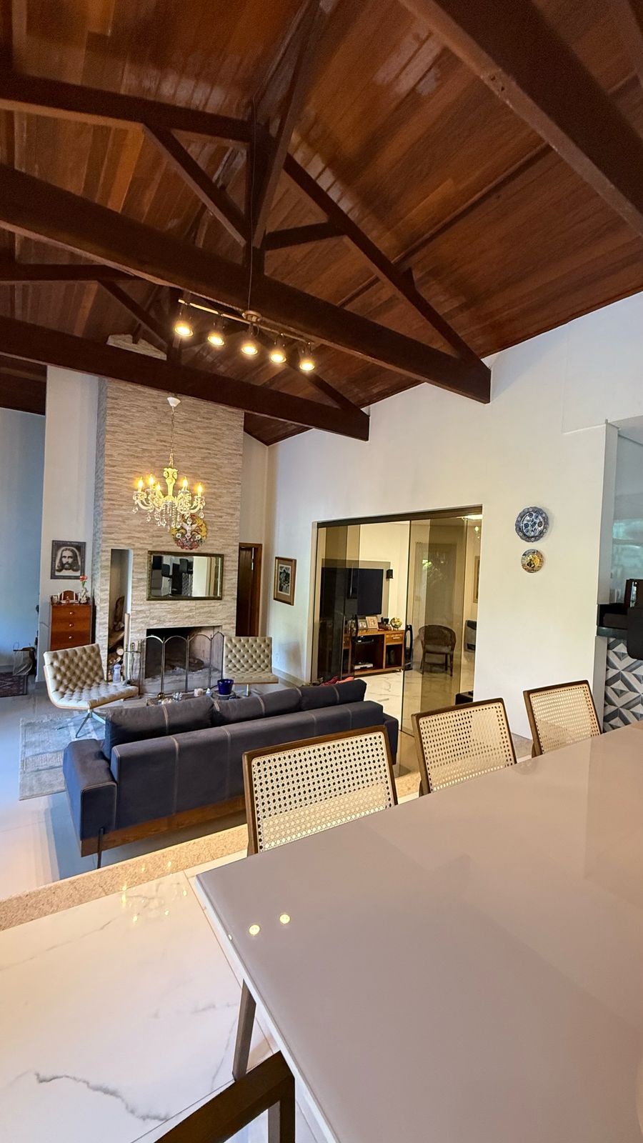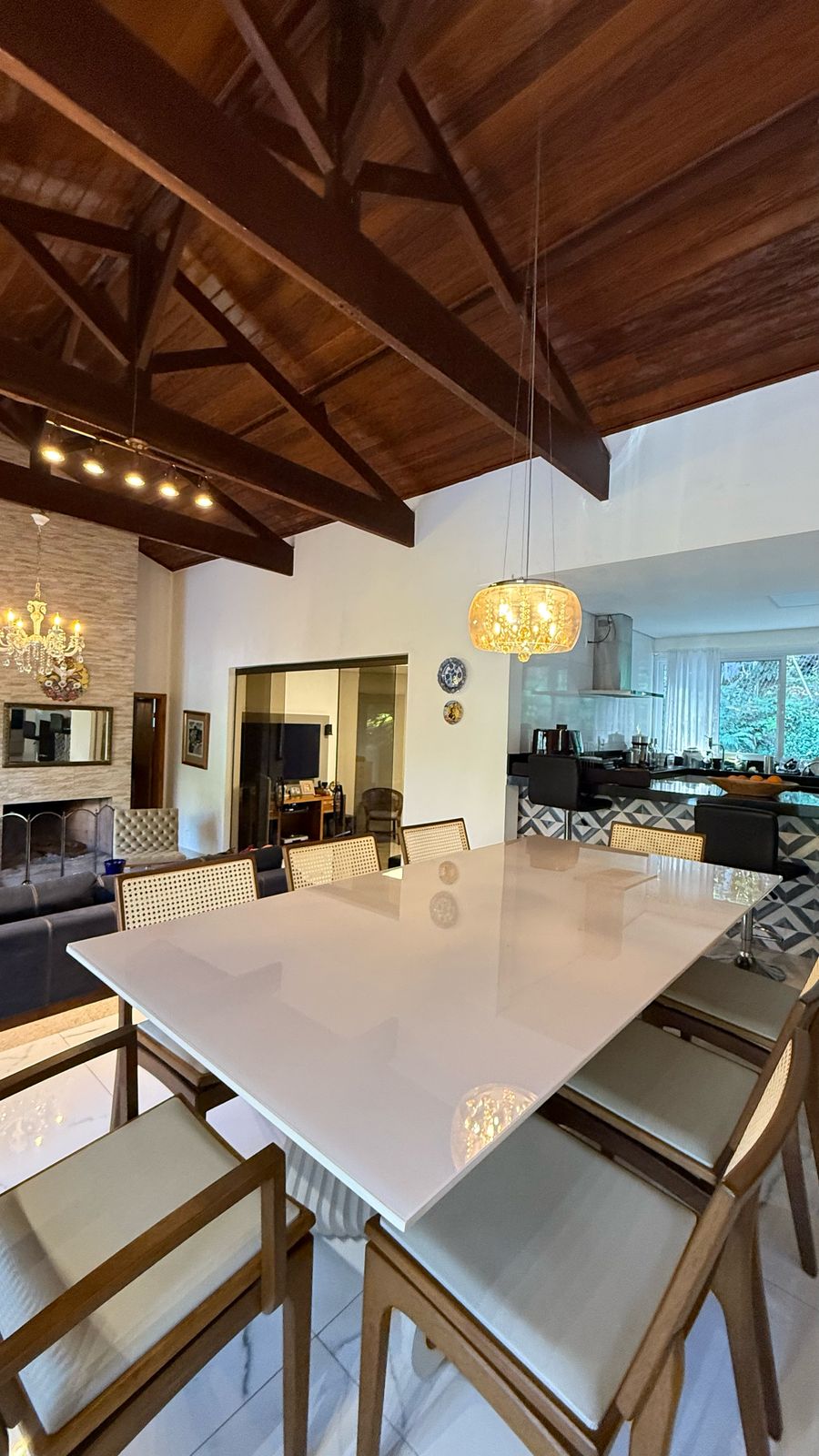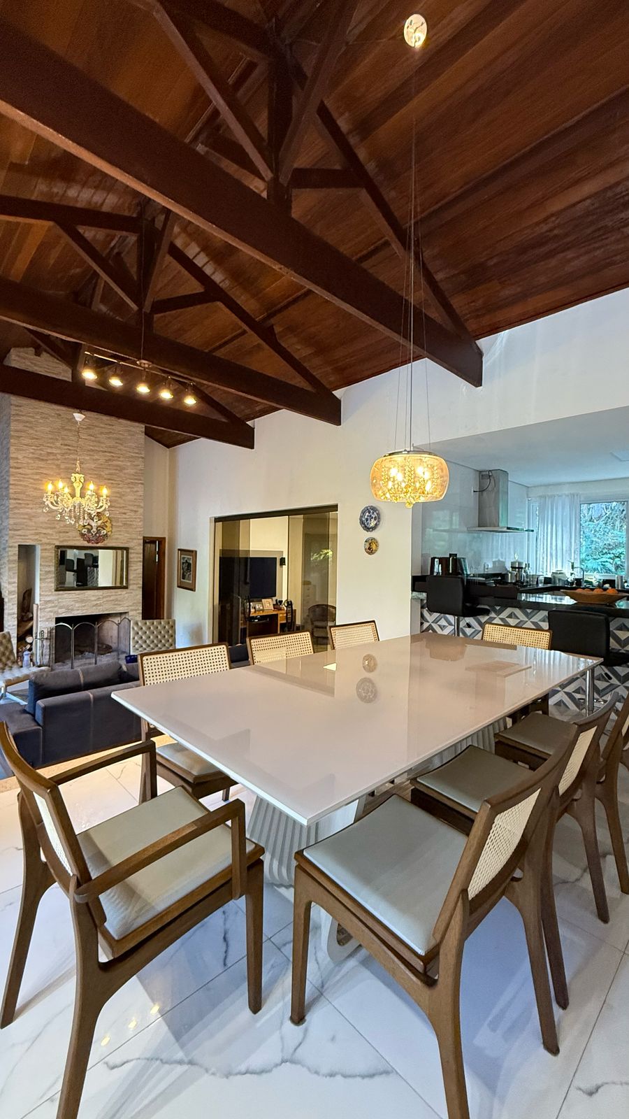 * Sala de estar com lareira, integrada à sala de jantar com louçaria