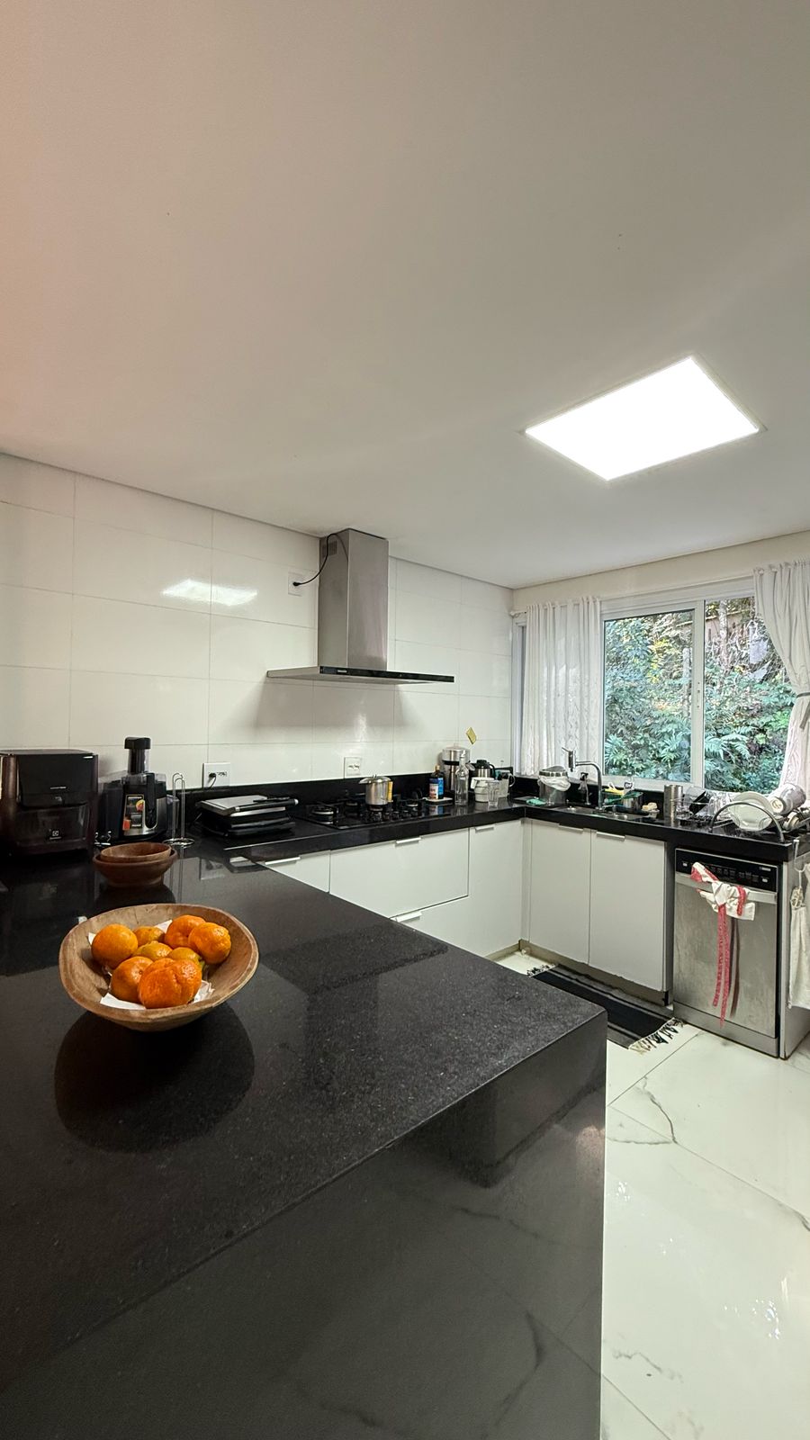 * Cozinha montada com armários planejados, bancadas em granito, forno, fogão e coifa inox